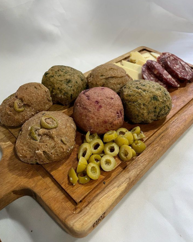 La imagen muestra una selección de panes perfectos para tus picadas. Tenemos panes de Espinaca, Queso, Cebolla, Aceituna y Remolacha, junto con una combinación de salame y queso quedan espectaculares. Cada uno aporta un sabor único. ¡Perfectos para compartir y disfrutar en compañía!