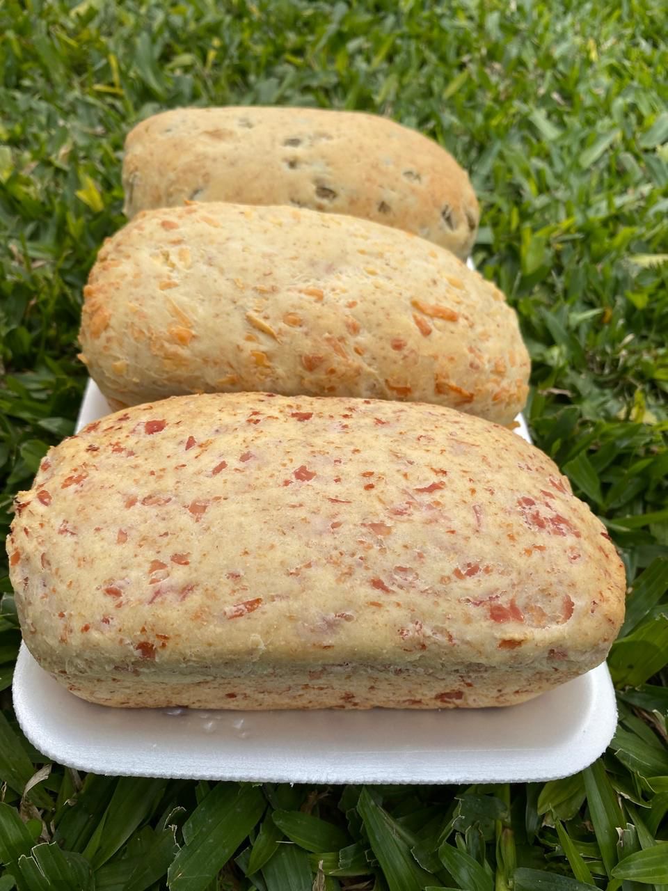 Trío de panes Keto artesanales de 320 g c/u, elaborados con harina de almendras. Incluye tres sabores: Jamón, Aceitunas verdes y Queso. De miga suave y textura esponjosa, son ideales para acompañar tus comidas o disfrutar solos, con sabor auténtico en cada rebanada.